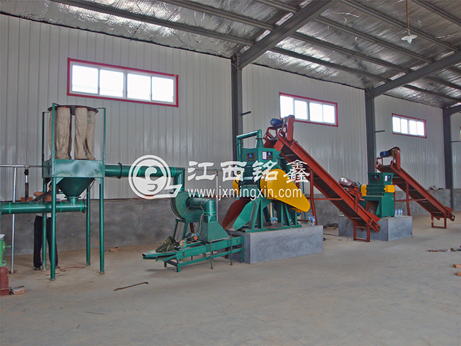 MX600型智能破碎機進行粗破 ---> 皮帶機輸送(磁選機除鐵) ---> MX500型干式銅米機細破(可加除塵系統) ---> MX1200型干式分選機分選出(粗、中、細銅米) ---> 風壓吸塑機將塑料(包含雜質和毛絲銅粉塵等)吸入聚料斗中 ----> 專用螺旋輸送 ---> 專用水選床水選